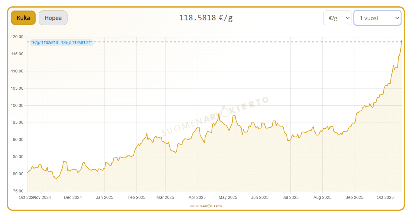 Tänään (17.10.2025) päivän huippu oli ≈ 120,41 €/g, eli kasvua yli +100 % tammi 2024 -tasosta vain 21 kuukaudessa.